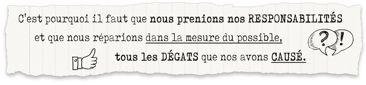 C’est pourquoi il faut que nous prenions nos responsabilités et que nous réparions dans la mesure du possible, tous les dégâts que nos avons causé.