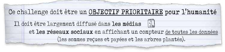 Ce challenge doit être un objectif prioritaire pour l’humanité et il doit être largement diffusé dans les médias et en affichant en temps réel un compteur exact de toutes les données (somme reçue et payée et arbres plantés) dans tous les médias et réseaux sociaux.